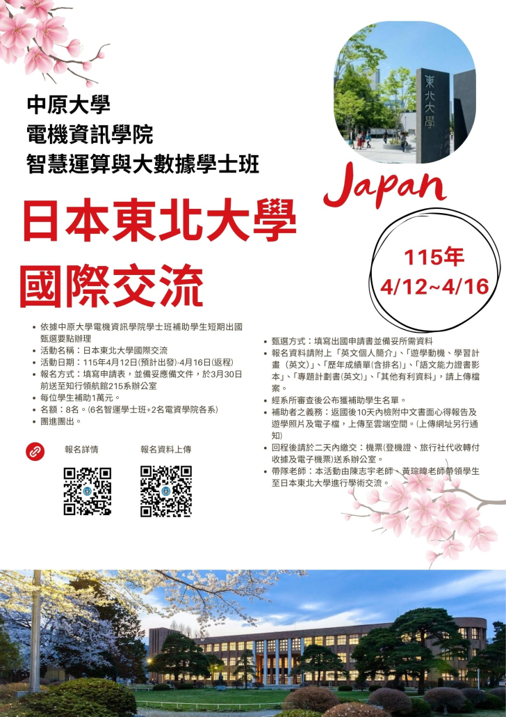 718642026-03-17 17:46:002026-03-18 15:32:50【114-2學期】中原大學電機資訊學院智慧運算與大數據學士班日本東北大學國際交流