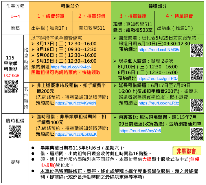 1. 畢業季租借流程:本學年度畢業季學位服租借期間為115年3月17日~115年5月19日,並依據上述表格之作業流程 1→2 的時間及時段(可先網路預約https://reurl.cc/NN3Qvm),先至維澈1F出納組繳費領單;填寫系所、姓名、學號、服裝尺寸後,持單領借服裝。